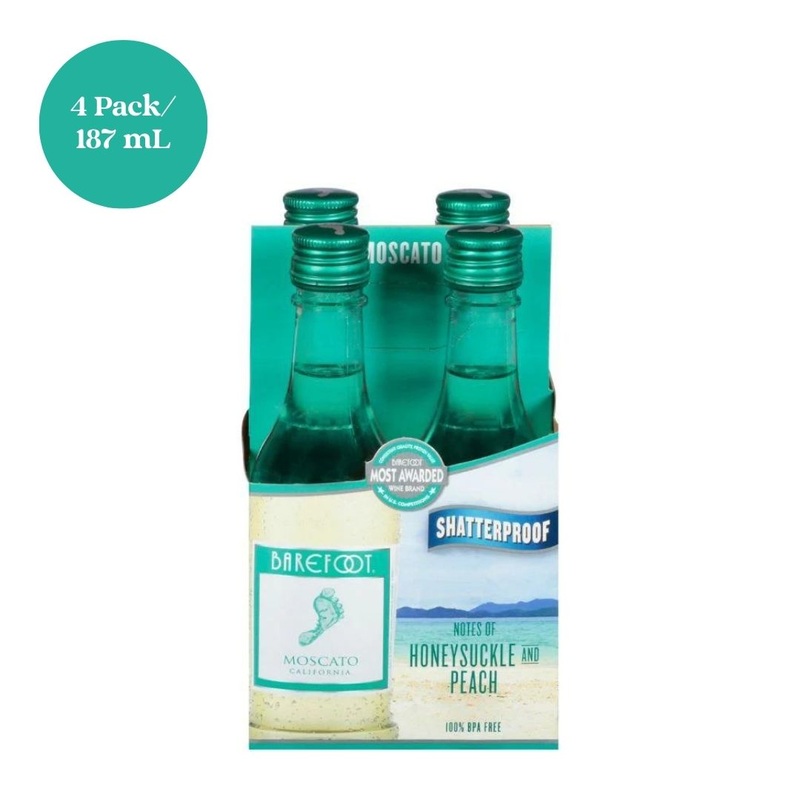 A perfect mini-pack of Barefoot Moscato for individual servings or sharing with a small group. Each 187mL can holds a sweet and refreshing white wine with flavors of tropical pineapple, orange blossom, juicy peach, honey and lemon zest for a crisp finish