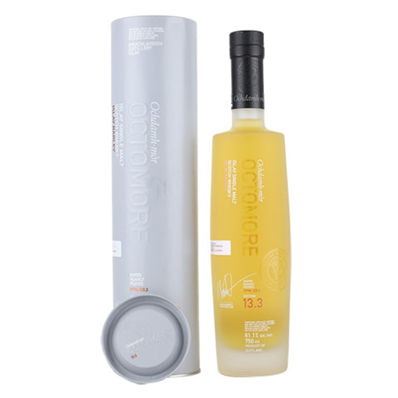 Scotch Whisky | 61.1% ABVCommercial Description:Octomore 13.3 demonstrates the phenomenal force of flavour when combining super-heavy peat with the variable harvests gathered from the island of Islay, raised by friend and farmer James Brown on one singular