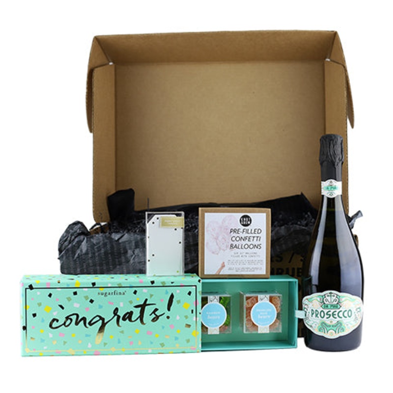 Celebrate Good Times, Come On! (Lets Celebrate)! This gourmetCelebration Kithas everything you need to kick start a celebration party!The Deluxe Box includes:Sparkling WineA selection of three gourmet Sugarfina boxed confectionery in a branded Congrats' Gi