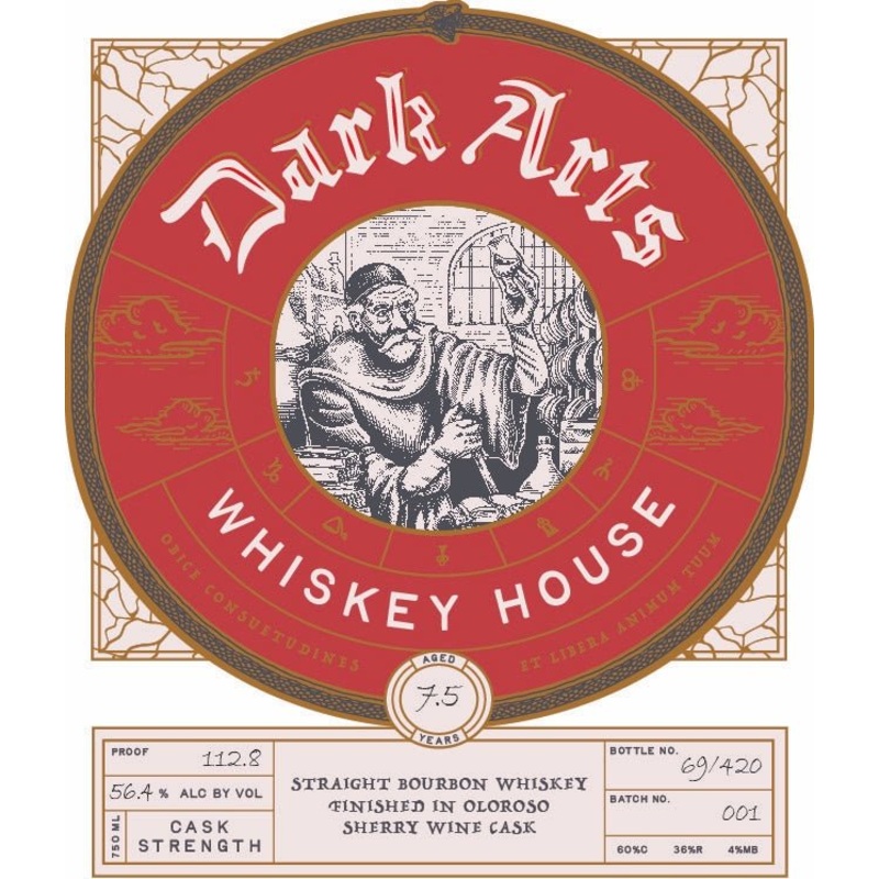 Dark Arts Whiskey House presents its masterpiece: Straight Bourbon Whiskey, aged 7.5 years and finished in Oloroso Sherry Casks. Bottled at an impressive cask strength of 112.8 proof (56.4% ABV), this whiskey is a true alchemical blend of traditional craftsmanship and bold innovation.