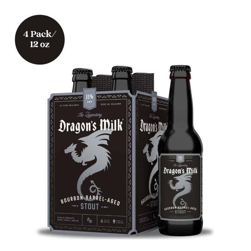 Dragon's Milk Bourbon Barrel Aged Stout is a rich, complex stout aged in bourbon barrels, offering deep vanilla, chocolate, and coffee notes with a robust bourbon finish. This 4-pack of 12oz bottles is ideal for those who savor intense, full-bodied dark be