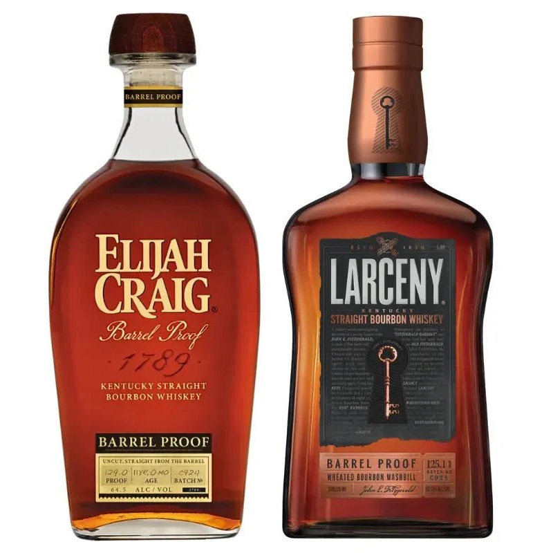 This premium bourbon whiskey bundle features two outstanding barrel proof selections: Elijah Craig Barrel Proof Kentucky Straight Bourbon and Larceny Barrel Proof Wheated Bourbon. Elijah Craig is a 12-year aged bourbon that delivers a bold, full-bodied exp