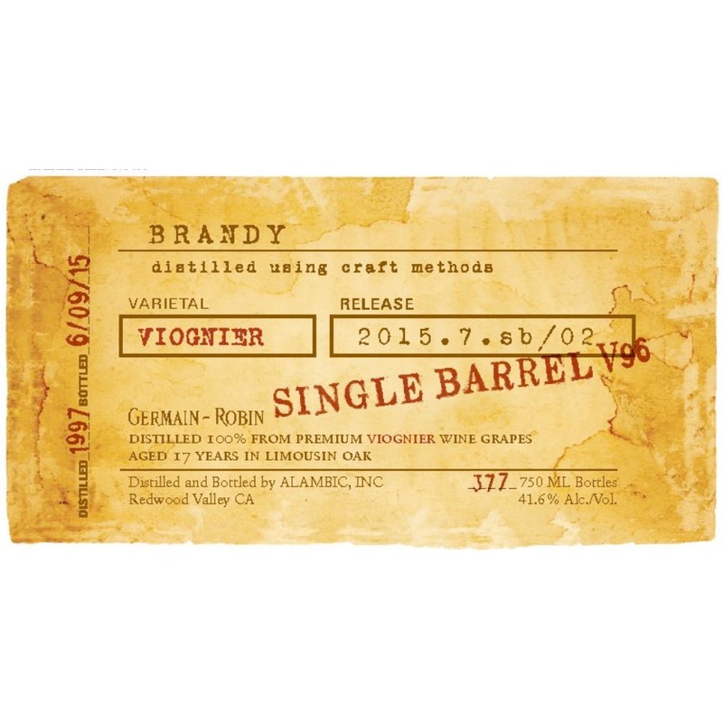 Germain-Robin Single Barrel V96 17 Year Old Brandy is distilled using craft methods. Distilled 100% from premium Viognier wine grapes. Aged 17 years in Limousin oak.