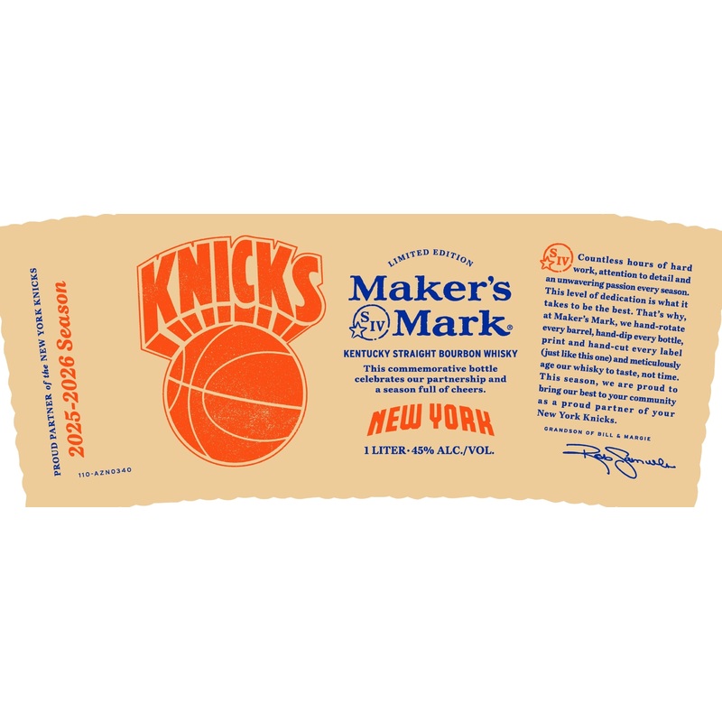 This New York Knicks 2025-2026 Season Limited Edition is a commemorative release celebrating the Knicks and their partnership with Makers Mark, featuring a unique label and the brands iconic hand-dipped wax seal.
