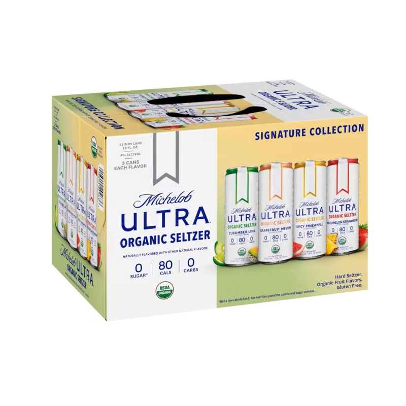 The Michelob Ultra Organic Hard Seltzer Signature Collection features a curated assortment of three distinct flavors, each crafted with organic ingredients to deliver a pure and refreshing hard seltzer experience. Packaged in a 12-pack of 12oz cans, this c