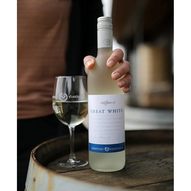 Great White has been our most well-known wine for over 25 years! This blend of Cayuga, Riesling and Vidal Blanc is very easy sipping and a big favorite. Its forward tropical fruit notes are comparable to a Pinot Grigio, with an extra hint of sweetness and a nice bite to its finish, hence the sharp teeth that give it its name!